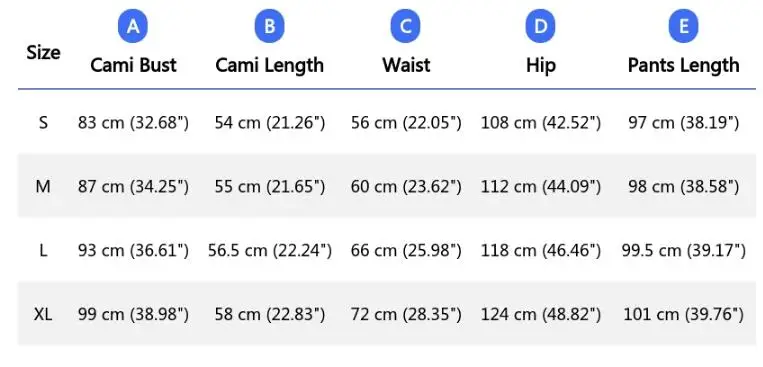 Size S: Cami Bust 83 cm (32.68”), Cami Length 54 cm (21.26”), Waist 56 cm (22.05”), Hip 108 cm (42.52”), Pants Length 97 cm (38.19”)
